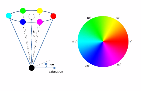 - H(ue) : 색상. 일반적인 색 의미. (0도 : Red, 120도 : Green, 240도 : Blue)