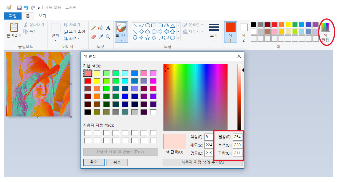 - OpenCV에서는 BGR로 표현 (그림판 색선택 이용 시 좌표가 반대(RGB)임)